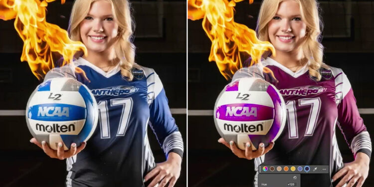 Hue/Sat absolutely works, but it takes a lot of fussing. As soon as you start dragging that hue slider or the Targeted Adjustment Tool (which I used), you’re not just shifting the jersey—you’re also adjusting the ball and anything else Photoshop thinks is in that color family. Then you’re messing with those little color-range brackets, trying to widen or narrow them. Before you know it, you’re cleaning up masks and doing way more work than you meant to.